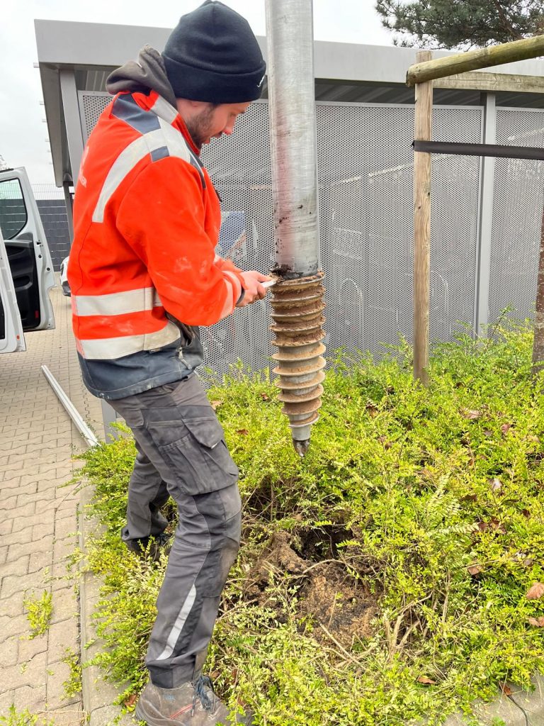 Heute haben wir vor Ort Belastungstests mit Probebohrungen durchgeführt, um die Gründeranker (Schraubfundamente) für die Fundamentierung eines Solar-Carport-Systems zu verproben.